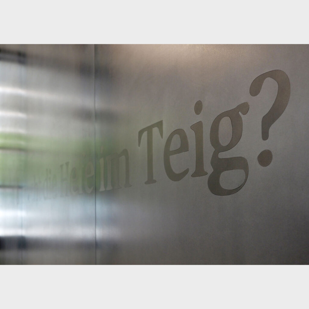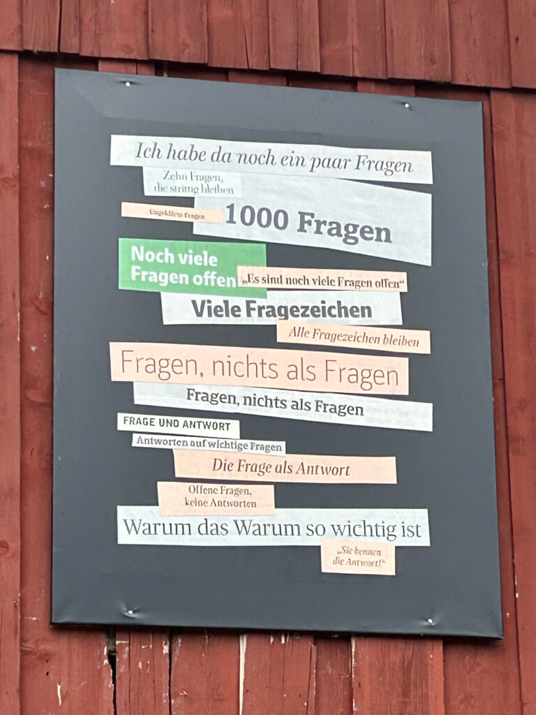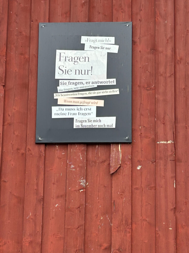 Fragen reizen Veronika Schubert als zentrales Element in der Kommunikation, aber auch aufgrund des formalen Aspekts, weil eine Vielzahl von Sätzen mit derselben Formulierung beginnt. Bei der Wandgestaltung fürs Hofkultur- Festival kommt die Künstlerin mit der Leidenschaft für Worte, Sätze und Sprachsport indes fast gänzlich ohne Fragezeichen aus. Vielmehr sinniert sie über das Fragestellen. Lediglich die Bodenarbeit mit Kreidespray auf dem Zufahrtsweg wagt es ganz direkt zu fragen: „Fragen Sie sich das auch?“