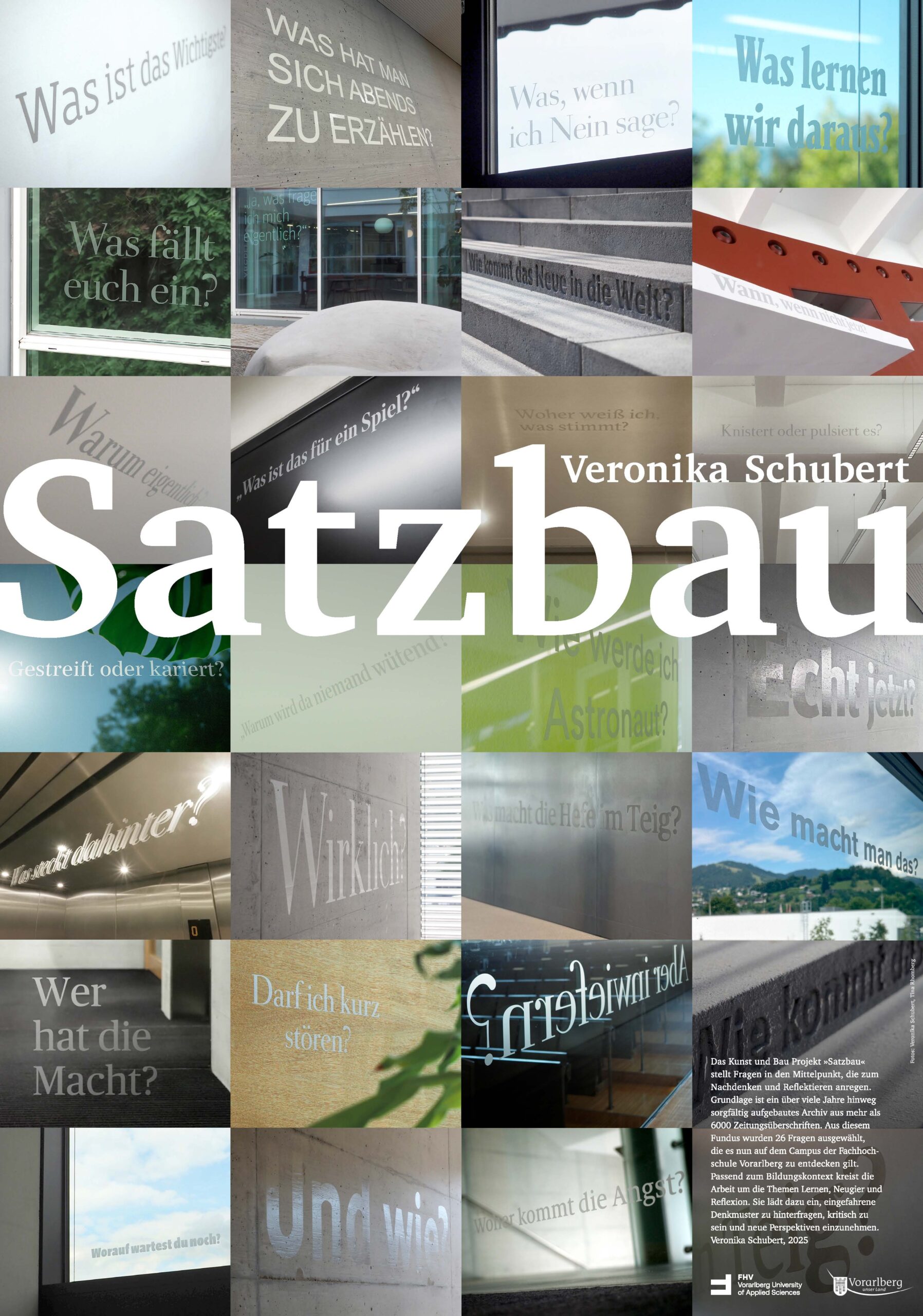 Aus diesem Fundus wurden 26 Fragen ausgewählt, die es nun auf dem Campus der Fachhochschule Vorarlberg zu entdecken gilt. Passend zum Bildungskontext kreist die Arbeit um die Themen Lernen, Neugier und Reflexion. Sie lädt dazu ein, eingefahrene Denkmuster zu hinterfragen, kritisch zu sein und neue Perspektiven einzunehmen.