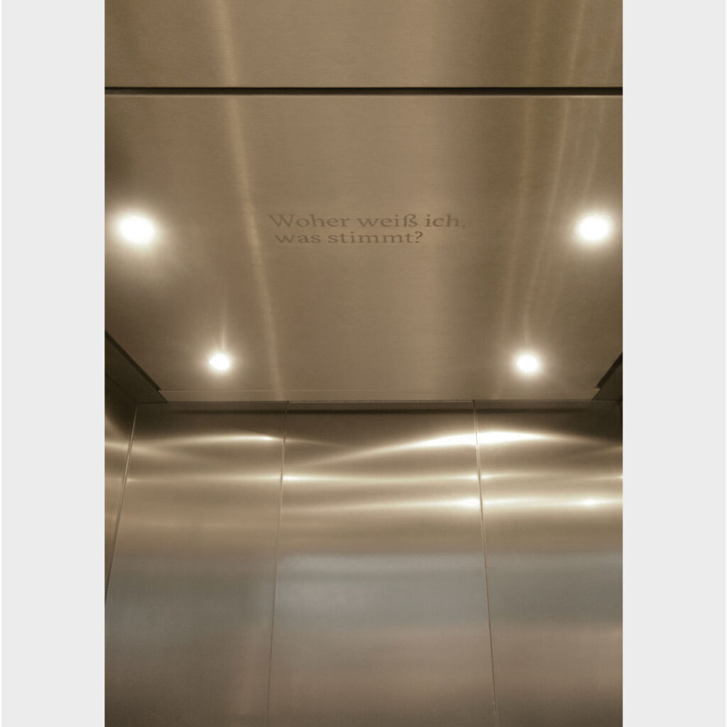„Die Frage aller Fragen“, so der Titel der Arbeit, versammelt vier auf Rahmen gespannte, hinterleuchtete Wandcollagen aus Zeitungsüberschriften als Folienprints verschiedener Größe. Die Aufmacher stammen aus dem überreichen, in mehr als 20 Jahren zusammengetragenen Archiv der Künstlerin als Sammlung von abertausenden Sätzen und Überschriften aus Zeitungen und Magazinen. Veronika Schubert bedient sich aus der Fülle des Vorhandenen, plündert wunderbares Altpapier um das darin gefundene found footage thematisch zu ordnen, fein säuberlich physisch in Ordnern abzulegen und/oder zu digitalisieren.